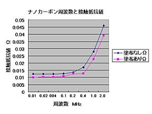 タバコの煙の粒子より小さなダイヤを使ったナノカーボン金属表面の凹凸に入り込んで接点面積を広げ、電気導通性を確実に。酸化も防いで半永久的に寿命を維持。ナノカーボンの15ナノメーター(100万分の15ミリメーター)の超微粒子は金属表面の凹凸に入り込むことで、接点が点から面に広がり、電気導通性が上がります。 電気導通効果をロータリースイッチで実証。 下の二つのグラフはロータリースイッチの接点部にナノカーボンを塗布したものと、塗布しないものの接触抵抗値(Inpedence)Ωを測定した結果です。2グラフとも同時のテストをプロットしたものですが、数値の差が見やすいようにするために周波数領域を0.01-2.0Mhzの低周波領域と、0.01-10Mhzの測定領域に分けて表示したものです。